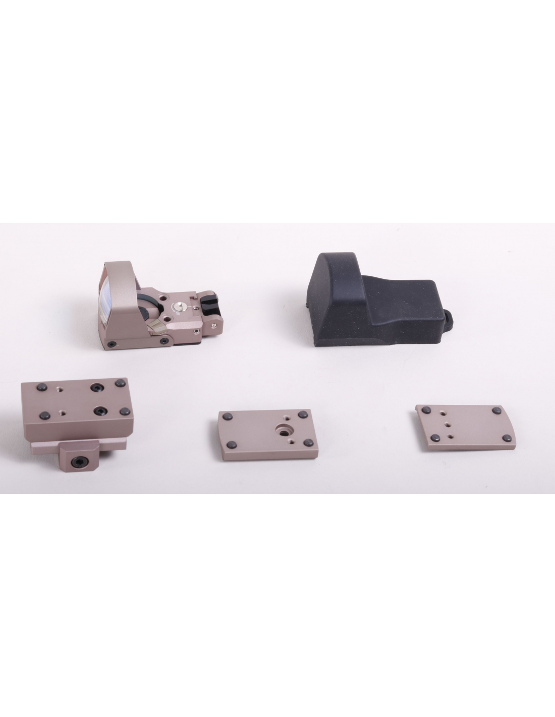 red dot with five brightnesses quick battery change light sensor and autosleep mode metal cased lens metal sights inside the package you will find the following attachments: glock (airsoft) 1911 (airsoft) picatinny