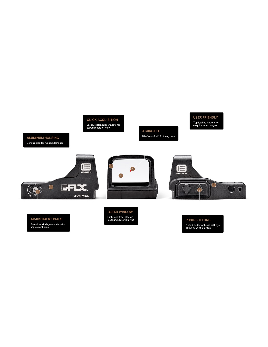 The EFLX™ is EOTECH’s first venture into reflex technology optics. Designed for pistol use, the base is configured to the Leupold® Delta Point Pro™ footprint and will adapt to appropriately milled slides or onto a rear dovetail mounting adapter. Its durable, heavy duty aluminum housing provides a large, square viewing window, that maintains the same aspect ratio as EOTECH’s HWS, to make the 3 or 6 MOA aiming dot easy and quick to find. A top load, single 2032 battery provides roughly 20,000 hours of run time. Ideal for professional use to get you on target fast; law enforcement, hunting, home defense, and more, the EFLX can be used on a variety of pistol platforms. In addition to being the ideal solution for a pistol red dot sight, the EFLX can be used as a 1X solution on shotguns or rifles with magnified optics. Read through the additional technical specs provided for more information on the EFLX features and all that make it one of the best red dot pistol sights available.