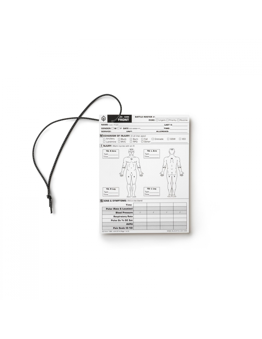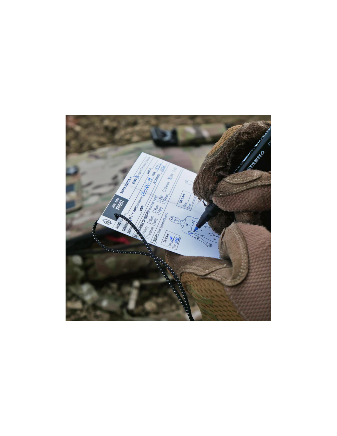 Una TCCC-Card integra e correttamente compilata contribuisce ad aumentare le probabilità di sopravvivenza del paziente. Per questo motivo abbiamo sviluppato una card in grado di garantire la corretta trascrizione delle informazioni (previste dal protocollo TCCC) anche durante usi gravosi e condizioni meteo avverse.