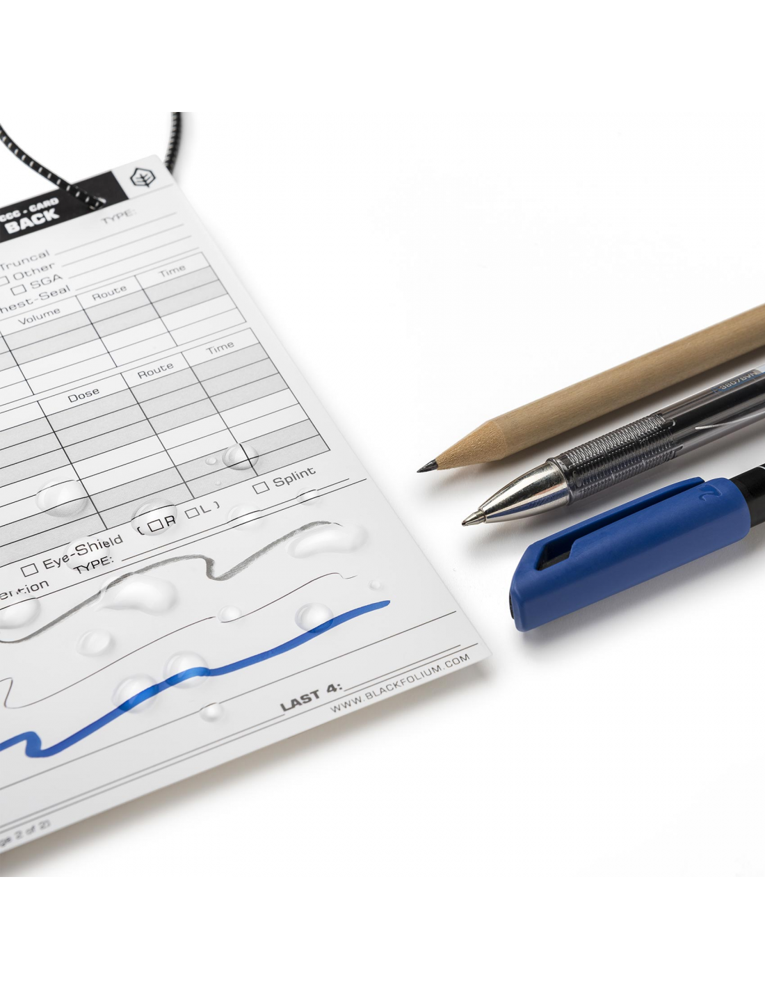 La procedura più utilizzata, per rendere le casualty cards resistenti, è quella di ricorrere alla plastificazione della carta stessa. Questo metodo però presenta un risvolto negativo da non sottovalutare: una volta plastificata la nostra card sarà compilabile esclusivamente con l'ausilio di un pennarello. A loro volta, i pennarelli, sono sensibili alle condizioni atmosferiche (provate a scivere su na superficie plastica bagnata) e al calore che si genera all'interno delle IFAK (soprattutto in ambienti desertici) con il rischio che non funzioni nel momento del bisogno. Abbiamo lavorato per risolvere questa sottile ma fondamentale problematica sviluppando la nostra TCCC-Card che mantiene le proprietà del materiale sintetico, come resistenza ed idrorepellenza, ma allo stesso tempo consentire la compilazione anche tramite la matita, attualmente lo strumento più sicuro ed affidabile.