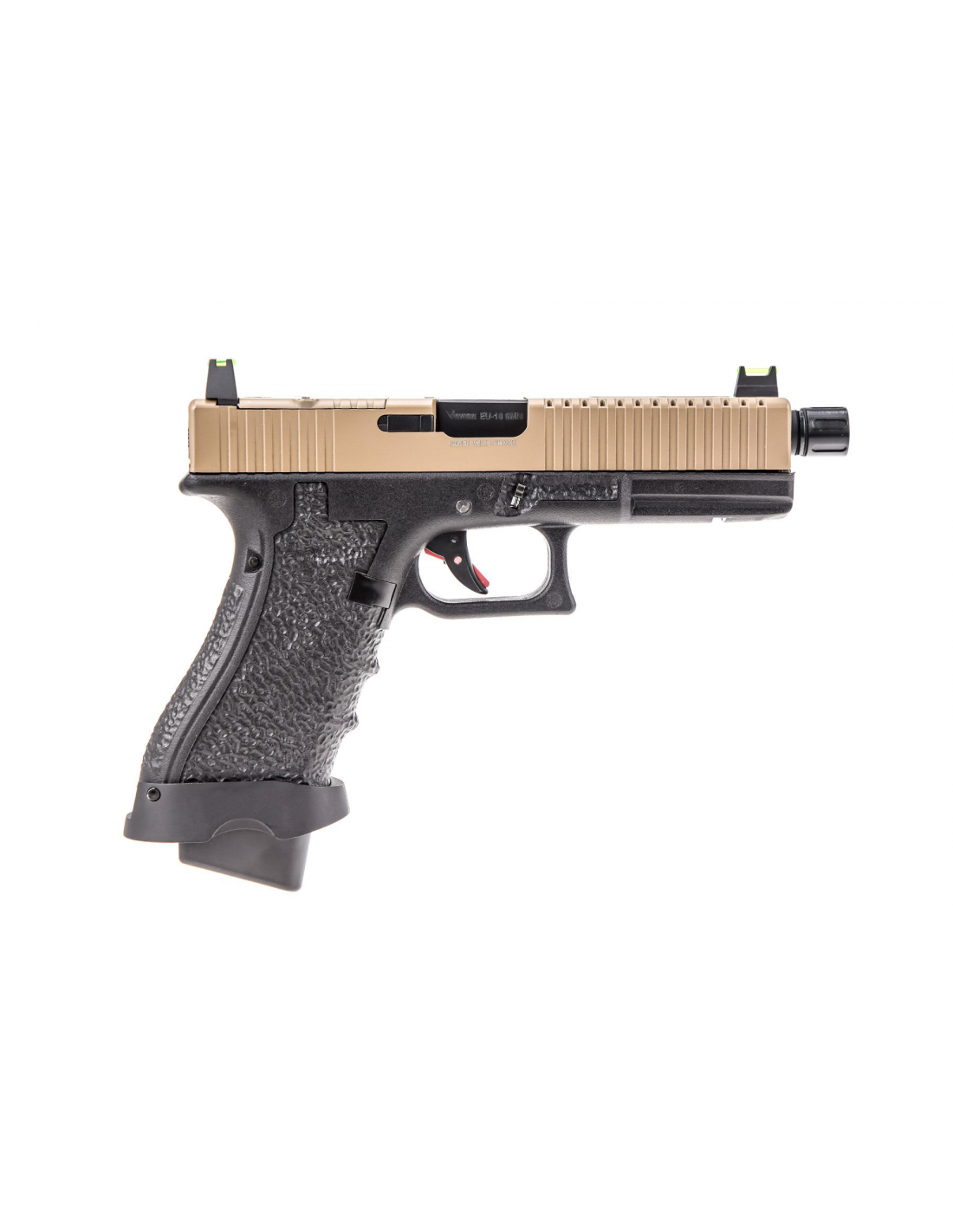 The VENTED slides distinctive forward vent ports give this EU platform its unique look. These “windows” look unto the fluted outer-barrel that is generally an alternative colour to the slide providing a truly different & eye-catching look. The vent ports also result in some slide weight-reduction which enhances the shooting experience as the recoil cycle is both faster & more “snappy” when compared to standard EU series GBB replicas. As mentioned above, the fluted outer barrel is often a chrome finish, along with the rest of the pistols frame mounted furniture that often results in a “triple-coloured” replica (eg. Tan, Black & Chrome) with some exceptions.