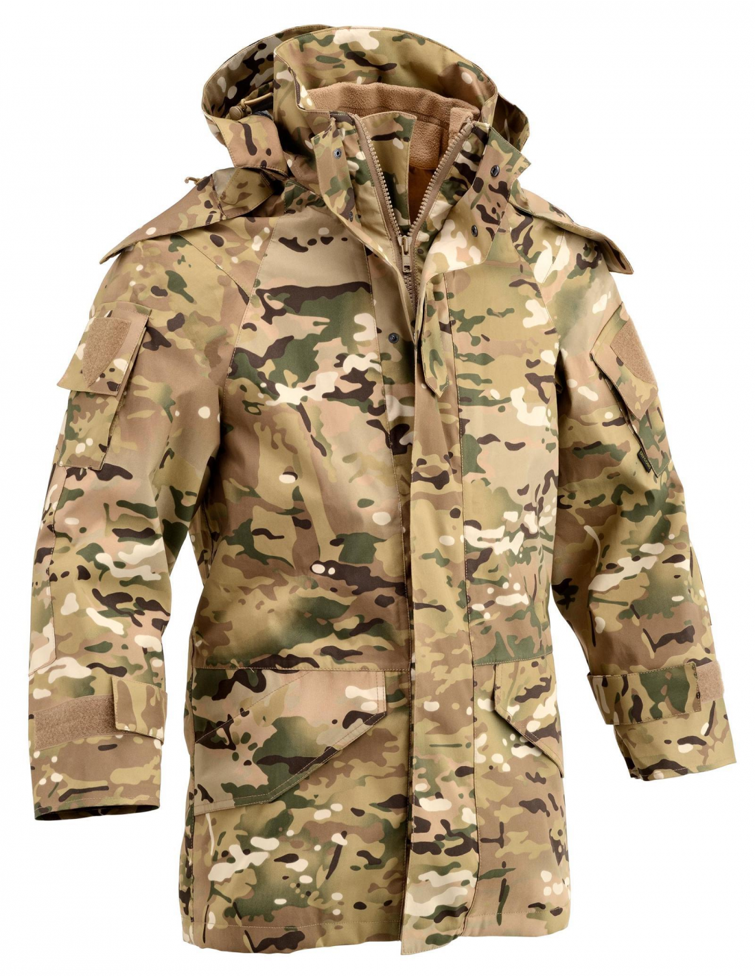 Costruita con 3 strati di POLIAMMIDE con trattamento esterno in PTFE, che lo rendono idrorepellente, antivento e traspirante, il parka ha una manifattura semirigida con cuciture sigillate da nastro HS, polsini regolabili, due cappucci di protezione, di cui uno fisso per la protezione del capo ed uno amovibile con visiera e regolazione per l’utilizzo sopra caschetto o elmetto. La giacca viene fornita con pile interno rimovibile da cerniere che, una volta staccato, diventa una giacca utilizzabile separatamente. Il pile è da 450 gr/mq circa, ha polsini elastici, 2 tasche richiudibili a cerniera sui fianchi e velcro per il posizionamento di scudetto, grado, nome, arma di appartenenza.