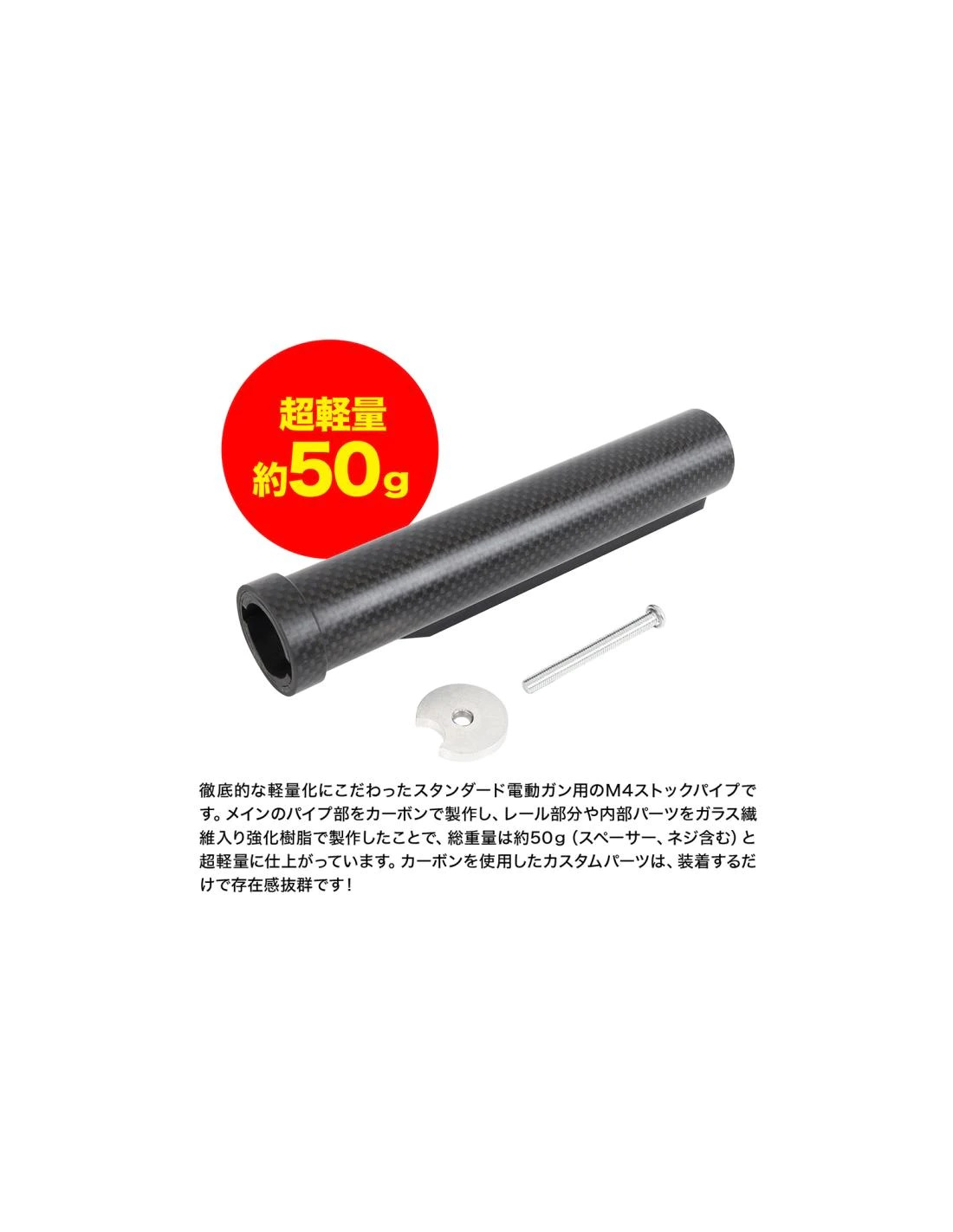 Si tratta di un tubo di calcio M4 standard progettato per fucili elettrici con una forte enfasi sulla leggerezza estrema. La sezione principale del tubo è realizzata in carbonio, mentre le porzioni del binario e le parti interne sono realizzate con resina rinforzata con fibra di vetro, per un peso totale di circa 50 g (inclusi distanziali e viti): una finitura ultraleggera. Le parti personalizzate che utilizzano il carbonio creano una dichiarazione visiva sorprendente quando installate.